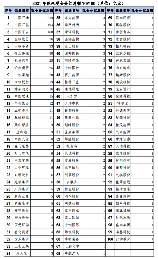 根据Wind数据,2021年以来,上市公司现金分红总额前100企业已累计发放1,089亿。其中,现金分红总额超过100亿的企业有3家,分别是中国石油(239亿),中国石化(194亿)、中国平安(160亿)。现金分红总额不足1亿的企业共25家,现金分红总额合计不足20亿。