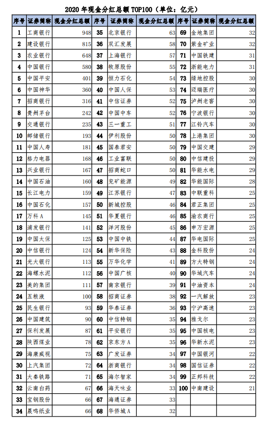 按分红规模,分红总额超10亿元的A股上市公司有194家,其中24家公司分红总额超100亿元。工商银行以948亿元分红总额排名第一,其次分别为建设银行(815亿元)、农业银行(647亿元)、中国银行(580亿元)。
