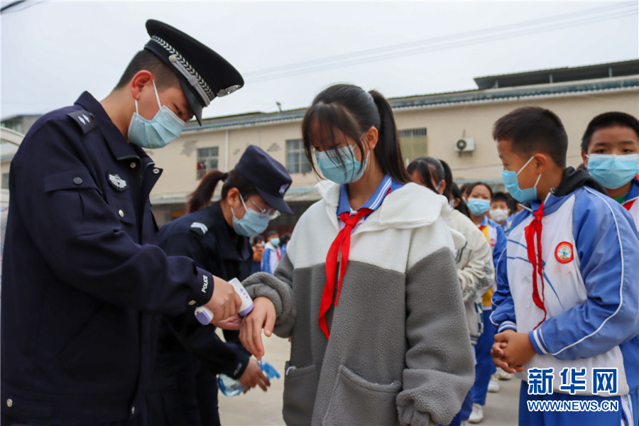 图为活动开始前,民警为学生测量体温(1月5日摄)。新华网发(云南临沧边境管理支队 供)