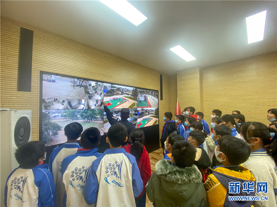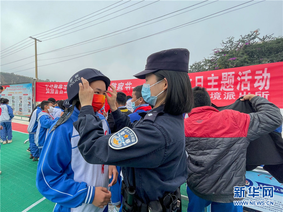 图为民警为学生试戴警用头盔(1月5日摄)。新华网发(云南临沧边境管理支队 供)