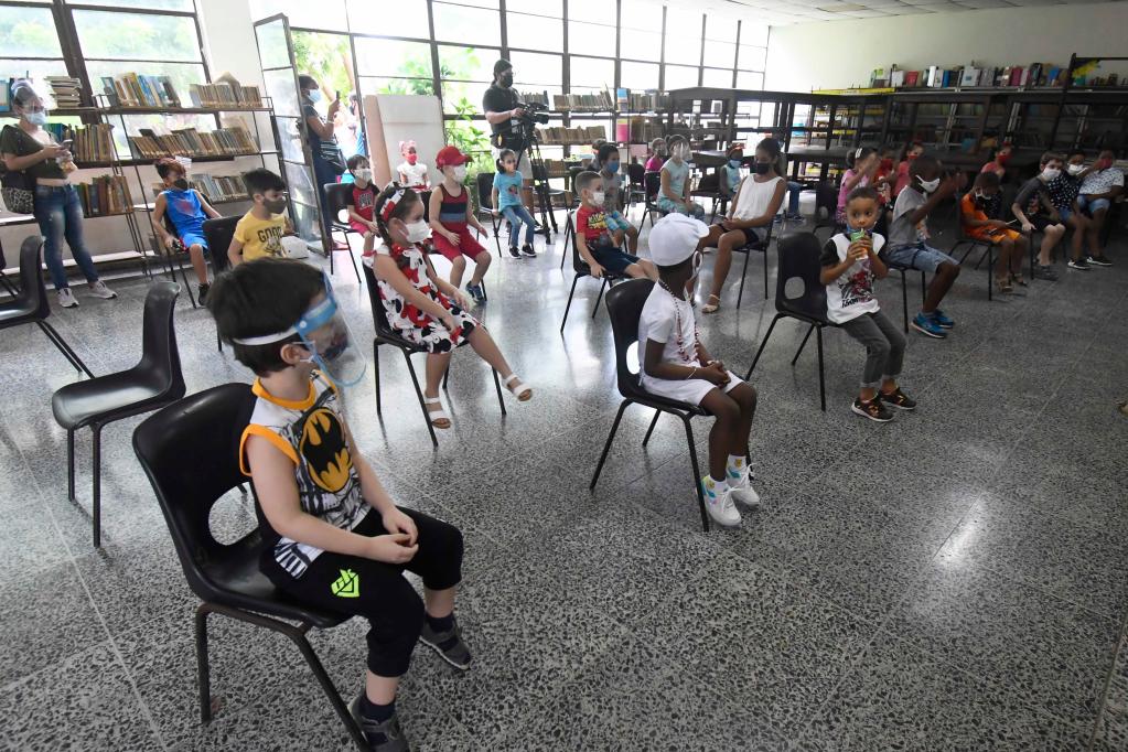 2021年9月16日,在古巴首都哈瓦那市中心的费利佩波伊小学,孩子们接种新冠疫苗后在教室留观。(新华社发,华金·埃尔南德斯摄)