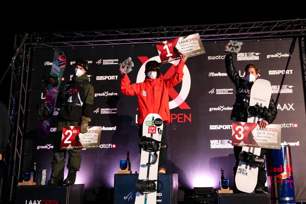1月15日,冠军日本选手平野步梦(中)、亚军瑞士选手扬·舍雷尔(左)和季军美国选手肖恩·怀特在U型场地男子组颁奖仪式上。新华社记者 张铖 摄