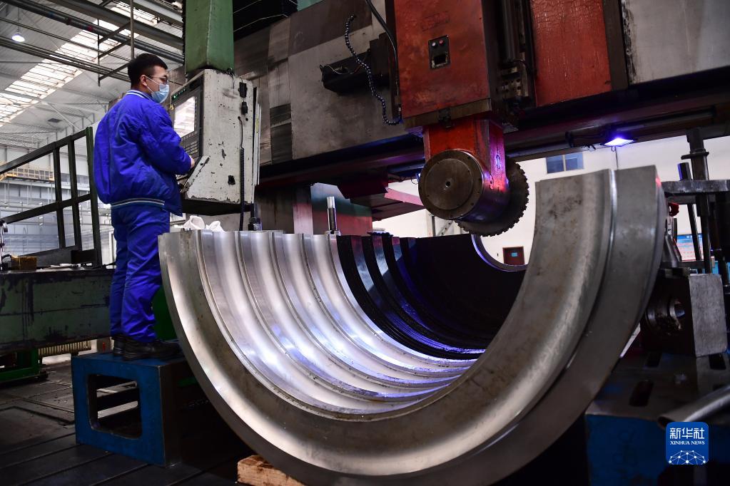 在沈阳鼓风机集团车间,工人操作机器加工产品内机壳(2020年3月16日摄)。新华社记者 杨青 摄