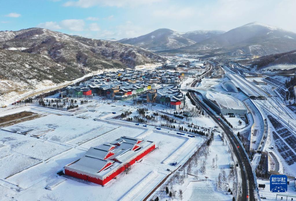 从空中俯瞰崇礼太子城,高铁站、冰雪小镇、冬奥村等新地标,如绚烂花朵,散落在燕山山脉之中。