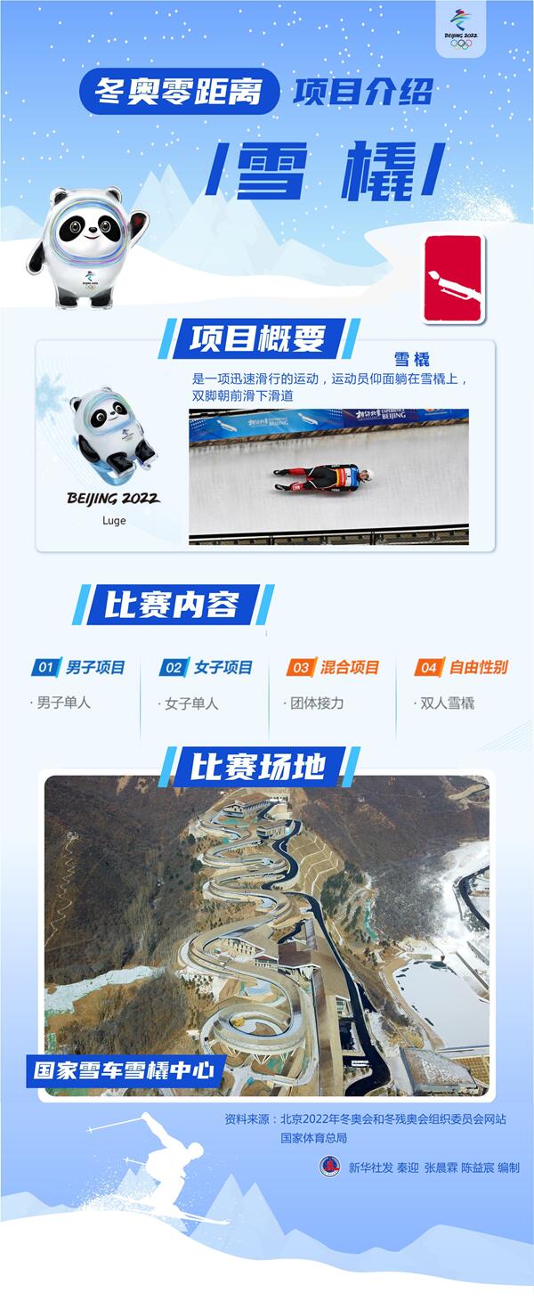 在“雪游龙”举行的北京冬奥会雪橇比赛共设有男子单人雪橇、女子单人雪橇、双人雪橇和雪橇团体接力4个小项。单人项目比赛滑行4次,双人项目滑行2次,接力项目需要完成男子单人、女子单人和双人项目的比赛。接力比赛中,终点线上方设有接力弹板,运动员通过终点前需坐起拍击弹板,从而开启起点处的出发挡板。所有项目都按每次滑行总用时排出名次。