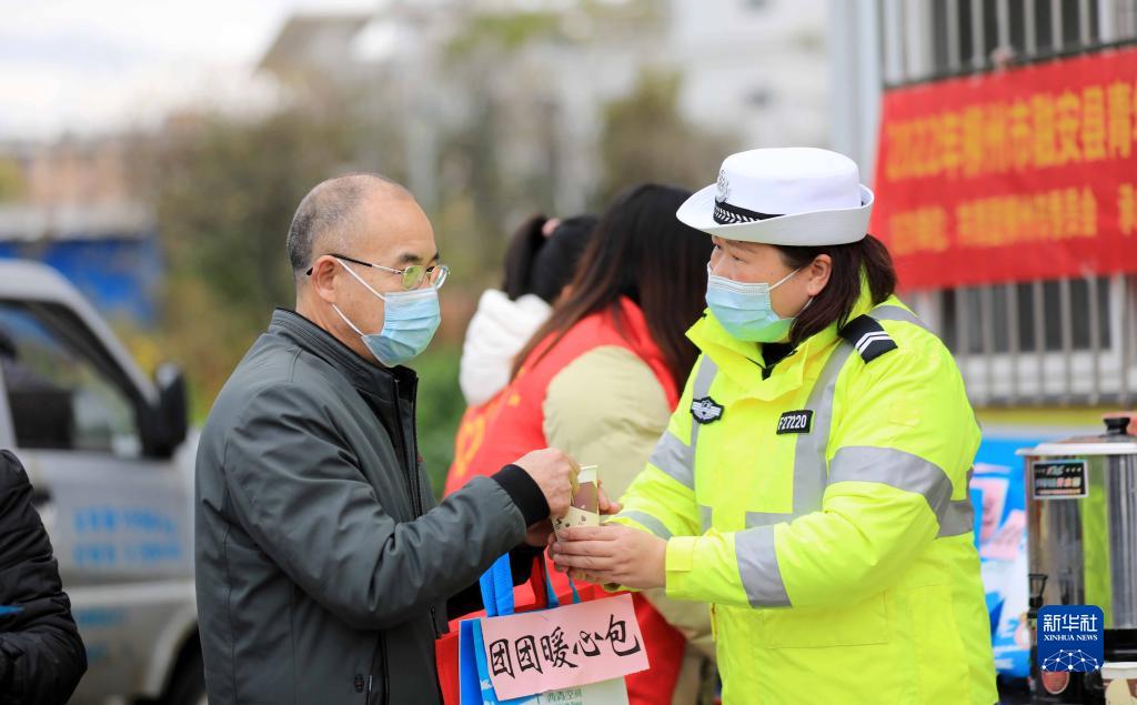 1月17日,在209国道广西柳州市融安县段“春运爱心驿站”,交通辅警为司乘人员送姜糖茶。新华社发(谭克兴摄)