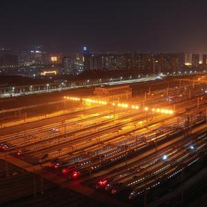 1月16日晚,动车组列车停靠在中国铁路兰州局集团有限公司兰州车辆段兰州西动车运用所整备场上,为1月17日开始的2022年春运做好准备(无人机照片)。新华社记者 杜哲宇 摄