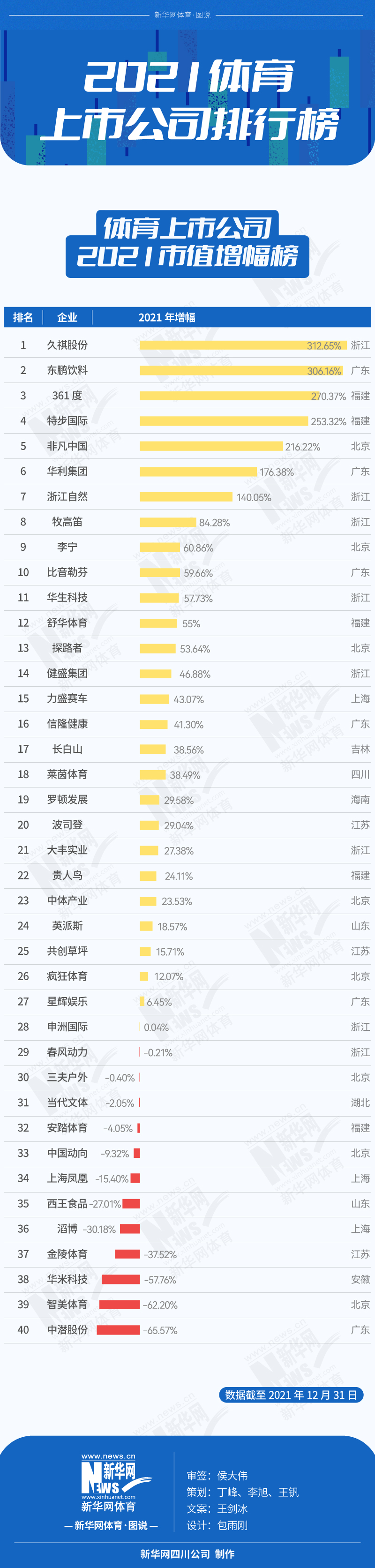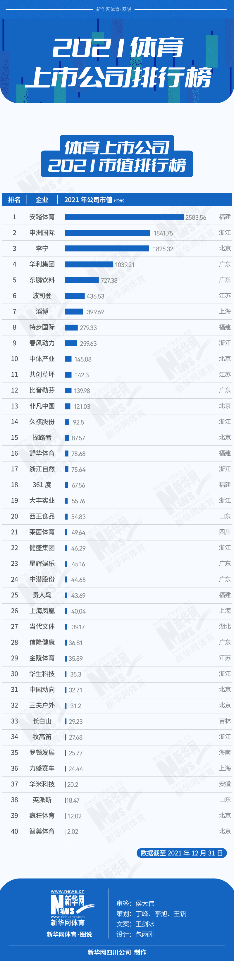 在2022年新的一年,随着全民健身国家战略的深入实施,北京冬奥会、成都大运会、杭州亚运会等体坛盛会的成功举办,健康中国和体育强国建设迈出新步伐,中国体育上市公司版图又将迎来哪些变化?新华网体育将持续保持关注。