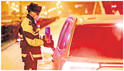1月22日,在天津市津南区某公路卡口处,骑警队员在核查进入人员的防疫信息。新华社发(张吉蔚摄)