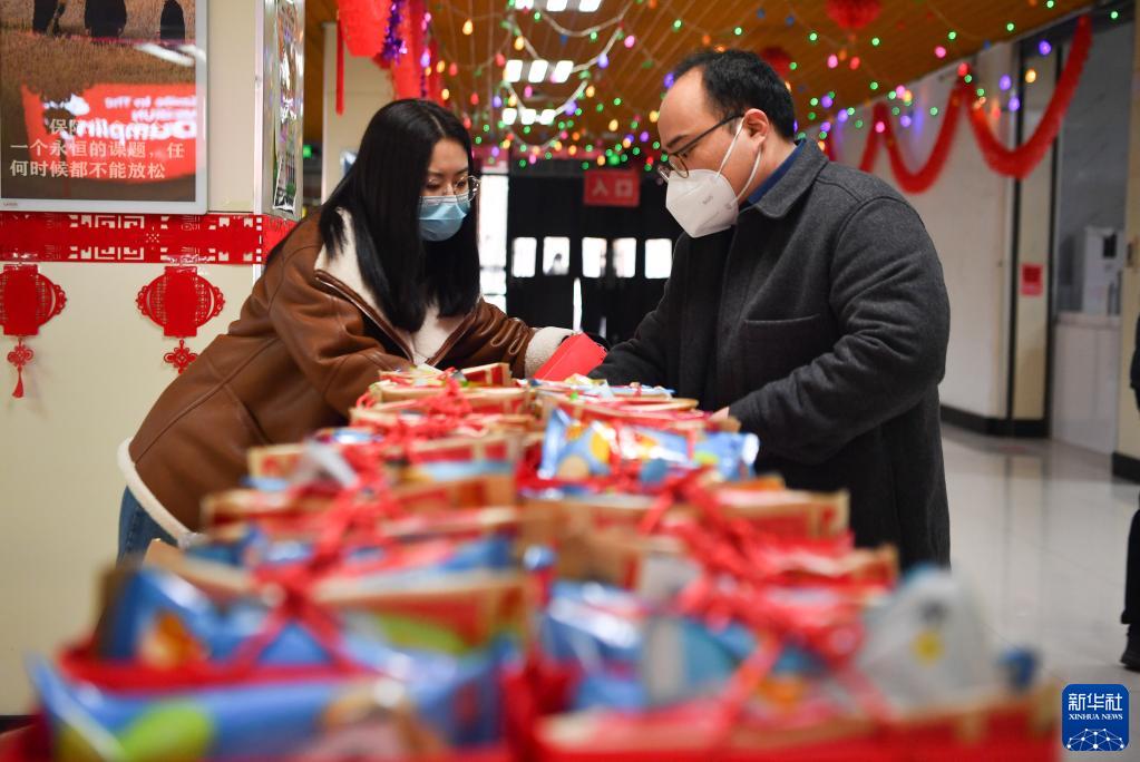 1月29日,工作人员在西安交通大学兴庆校区整理为留校学生发放的礼包。