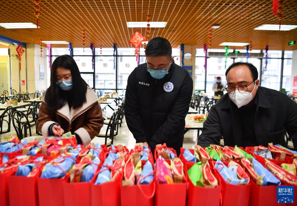 1月29日,工作人员在西安交通大学兴庆校区整理为留校学生发放的礼包。