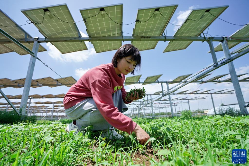 村民徐亚茹在河北省张北县德胜村“农光互补”项目区光伏发电板下查看药材长势(2020年6月23日摄)。新华社记者 牟宇 摄