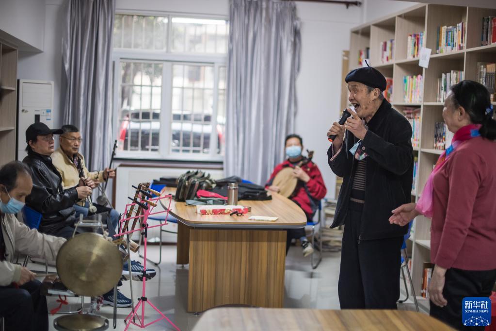 居民在湖北武汉东湖新城社区活动室唱楚剧(2021年3月31日摄)。新华社记者 肖艺九 摄