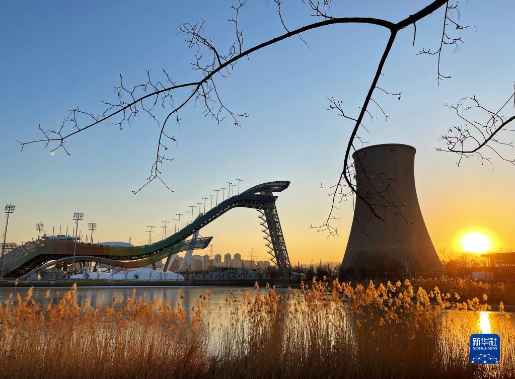 这是2021年12月28日拍摄的夕阳下的首钢滑雪大跳台。新华社记者 陶希夷 摄