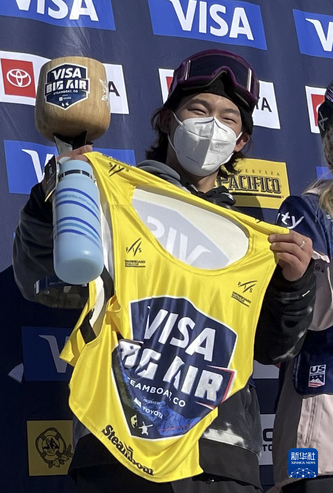 这是2021年12月4日,在2021-2022赛季单板滑雪大跳台世界杯美国斯廷博特站男子组颁奖仪式上,中国选手苏翊鸣庆祝夺冠。新华社发(李扬 摄)