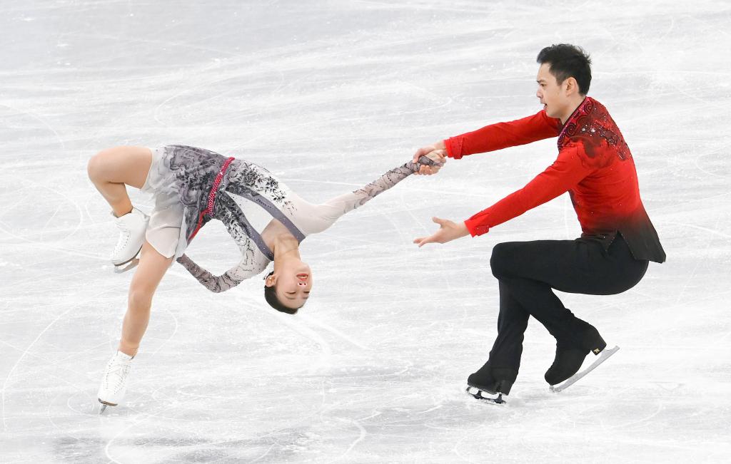 2月7日,中国选手彭程(左)、金杨在北京2022年冬奥会花样滑冰团体赛双人滑自由滑比赛中。新华社记者刘潇摄