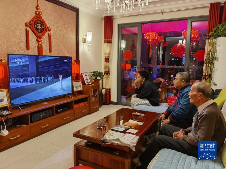 太原市民武之乃(右一)与儿孙们一起看冬奥会开幕。新华社记者 王学涛 摄