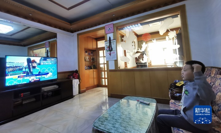 太原市小店区八一小学二年级学生杨晨赫在家收看冬奥会赛事。受访者供图