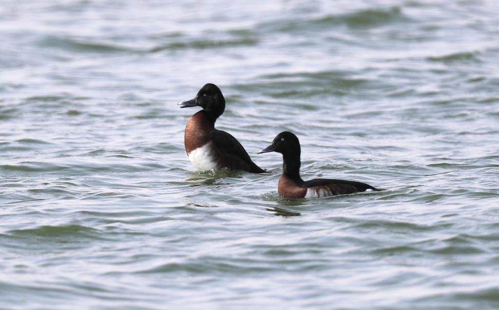 2月17日,在山东省东平湖水域,两只青头潜鸭在水面游动。新华社记者徐速绘摄