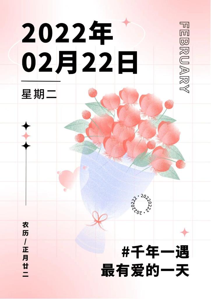 2022年2月22日,星期二,在中国农历里恰好也是正月的第22天。