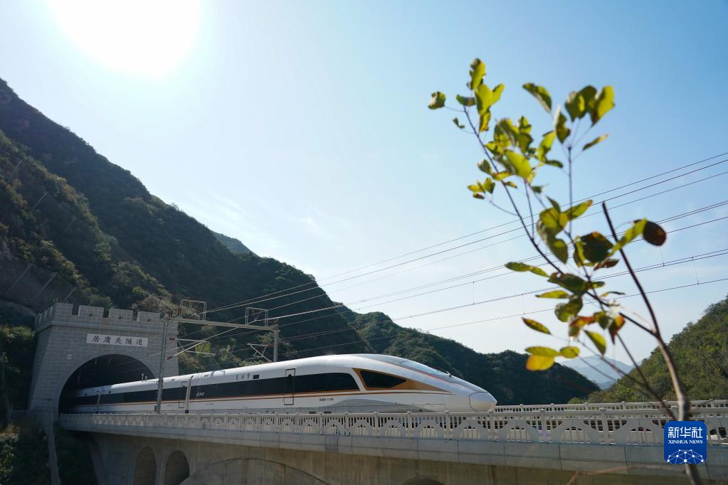 一列复兴号高铁列车穿过京张高铁居庸关隧道(2020年10月6日摄)。新华社记者 鞠焕宗 摄
