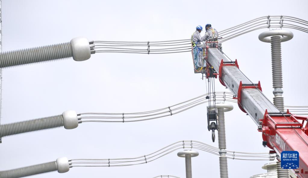 国网北京市电力公司延庆换流站的员工检查张北柔性直流电网输变电设备(2021年9月25日摄)。新华社记者 李欣 摄