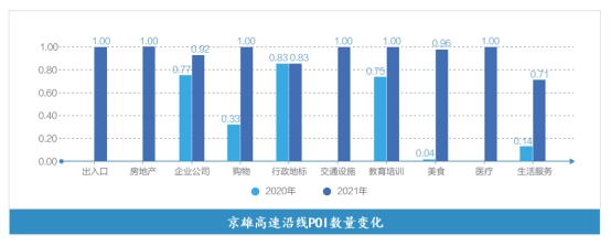 雄安新区重点交通工程的落成启用,成为带动相关产业发展的“加速器”。根据《报告》,2020年到2021年,京雄、津雄、津石、大广等重点高速沿线POI数量都有明显增加。以京雄城际铁路为例,沿线购物类、美食类和生活服务类POI数量都有多倍增加,医疗类、交通设施类、出入口类、房地产类POI数量均增加了100%。