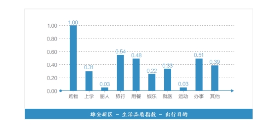 同时,《报告》还结合城市居民主要出行目的和生活品质指数(由休闲、文化、教育、体育等公共服务领域设施场所数量和本地人均搜索到访次数等指标汇总计算得出)两大数据维度,进一步解读雄安新区居民消费需求和生活品质的需求变化。据《报告》显示,2021年新区居民的生活品质指数中,购物、旅行、办事位列前三,居民消费意愿较强。