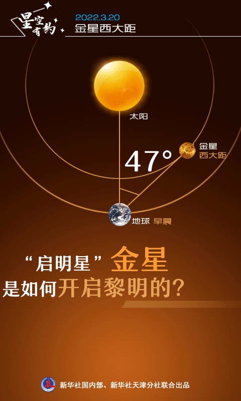 天津市天文学会理事、天津科学技术馆天文科普专家宋媛媛介绍,金星与水星同属内行星,金星距离太阳要远一些,所以会更容易被观测到。内行星与太阳的距角最大时,称为“大距”,并有“东大距”与“西大距”之分。内行星东大距时,位于太阳的东面,我们可以在傍晚时的西方低空看到它,从地球上看,此时它离太阳最远,被称为“昏星”(金星亦称“长庚星”);内行星西大距时,位于太阳的西面,我们可以在黎明时的东方低空看到它,从地球上看,此时它离太阳最远,被称为“晨星”(金星亦称“启明星”)。
