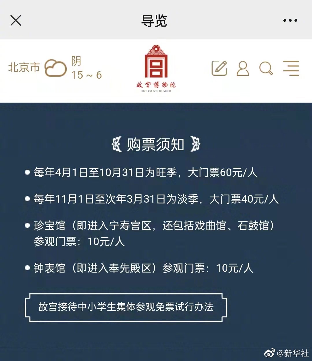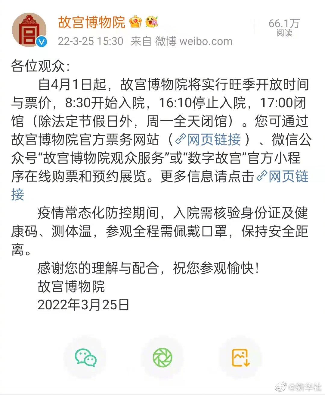 故宫博物院25日发布公告,自4月1日起将实行旺季开放时间与票价,8:30开始入院,16:10停止入院,17:00闭馆(除法定节假日外,周一全天闭馆)。
