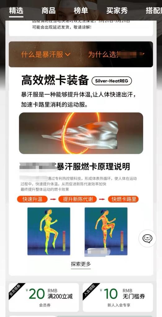 记者向一家热门单品月销超过6000件的某暴汗服网店咨询该产品,商家解释称,“暴汗服采用热控银科技面料,可以在体表形成热循环与热反射,热反射可多倍消耗热量提升身体代谢效果,热循环有效将身体毛孔打开激活汗腺,达到暴汗燃脂现象”,至于减肥效果,“客户反馈一般月瘦2-20斤左右”。一位销售主播还宣称,“只要是易胖体质,没时间运动的,都可以穿暴汗服,提高运动效率和效果”。