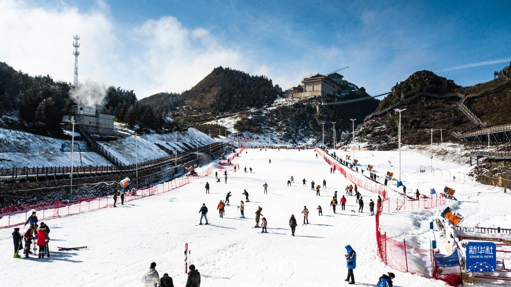 游客在六盘水市梅花山国际滑雪场享受滑雪乐趣(2019年1月16日摄,无人机照片)。新华社记者 陶亮 摄
