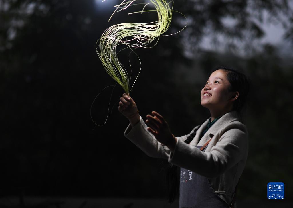 在贵州赤水市大同镇民族村,杨昌芹在非遗“赤水竹编”培训基地展示新制作的竹丝(2019年11月11日摄)。新华社记者 杨文斌 摄