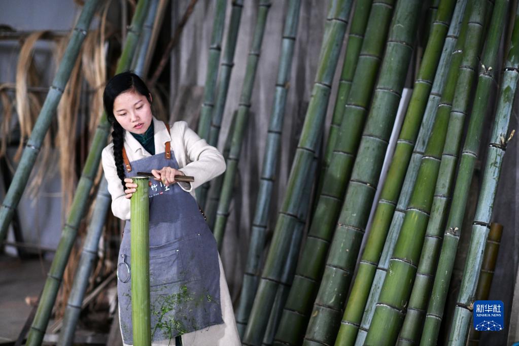 在贵州赤水市大同镇民族村,杨昌芹在非遗“赤水竹编”培训基地加工竹子(2019年11月11日摄)。新华社记者 杨文斌 摄
