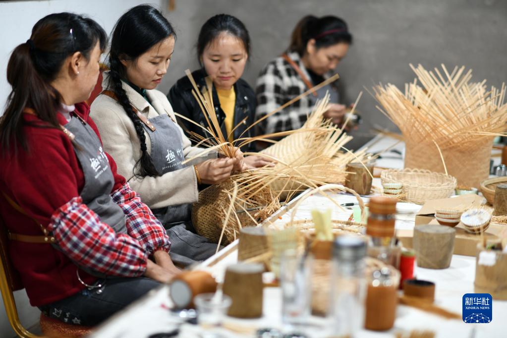 杨昌芹(左二)在非遗“赤水竹编”培训基地指导工人学习竹编(2019年11月11日摄)。新华社记者 杨文斌 摄