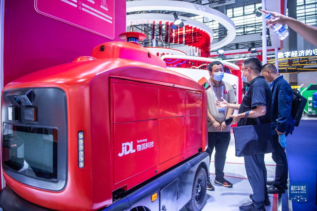 参会者在2021中国国际大数据产业博览会上了解无人驾驶快递运输车(2021年5月26日摄)。新华社记者 陶亮 摄