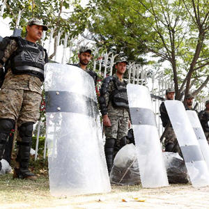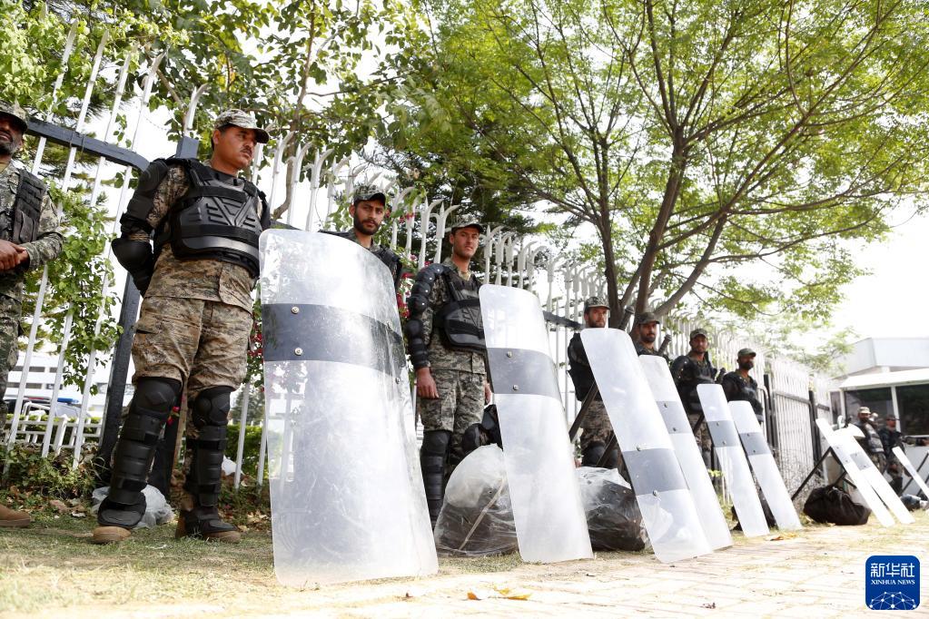 4月3日,安全人员在巴基斯坦首都伊斯兰堡的国民议会大楼外警戒。巴基斯坦总统秘书处3日说,总统阿尔维当天批准总理伊姆兰·汗的建议,宣布解散国民议会(议会下院)。新华社发(艾哈迈德·卡迈勒摄)