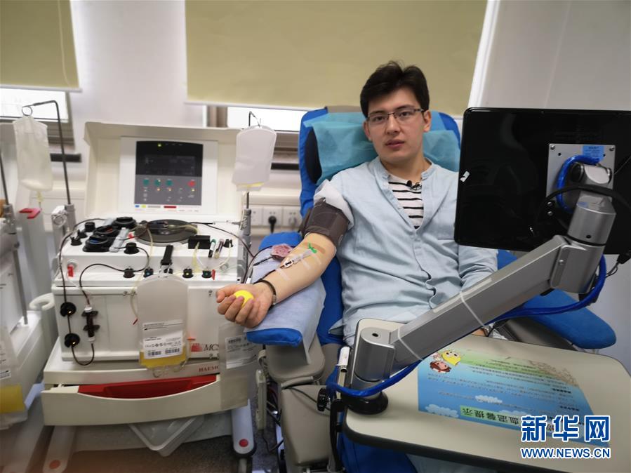 鲁斯兰在北京市红十字血液研究所献血(2018年5月22日摄)。新华社发