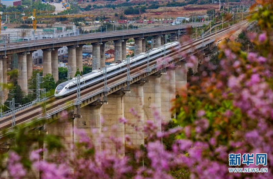 三四月间的云南,处处繁花,开行在云岭大地上的列车,时不时就“邂逅”烂漫的山花或成片的花田。跟随摄影师的镜头,看“米轨绿皮车”、普速列车、“复兴号”动车组等不同型号、不同颜色、不同速度的列车,穿越花海时的绝美瞬间。图为在昆明拍摄到的“和谐号”与花儿同框画面。新华网发(徐章位/摄 赵熠/文)