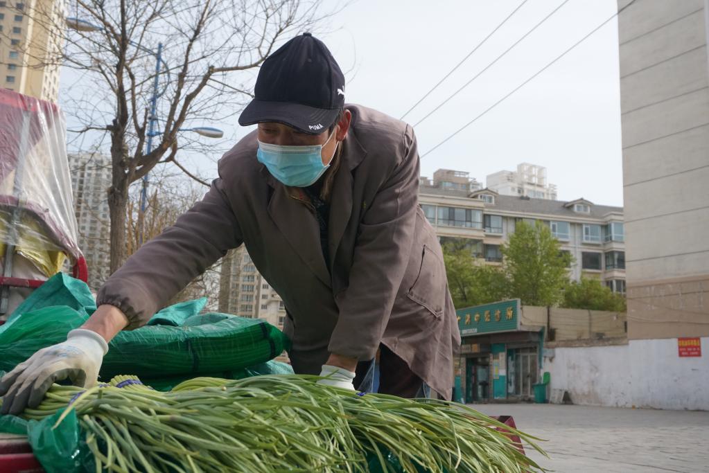 4月23日,在青海省西宁市城西区,蔬菜摊主胡兰营正在整理蔬菜。(新华社记者 周盛盛 摄)
