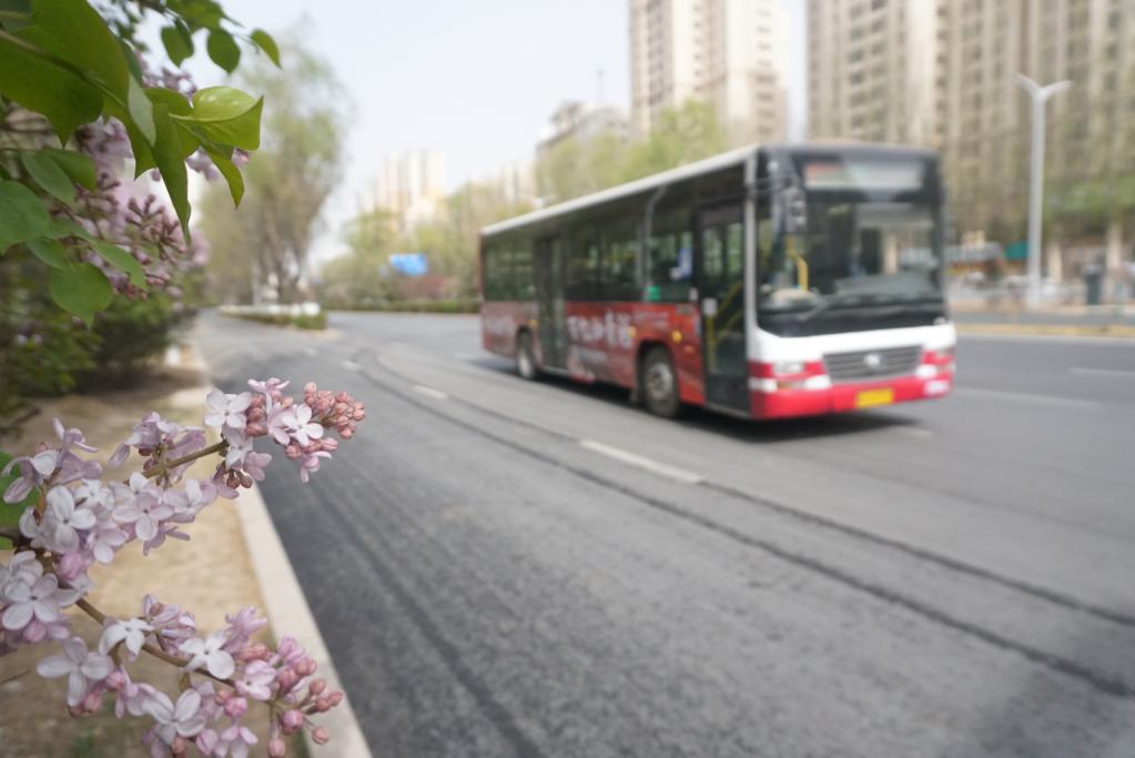 4月23日,在青海省西宁市城西区,一辆公交车驶过街头,路边的桃花已经盛开。(新华社记者 周盛盛 摄)