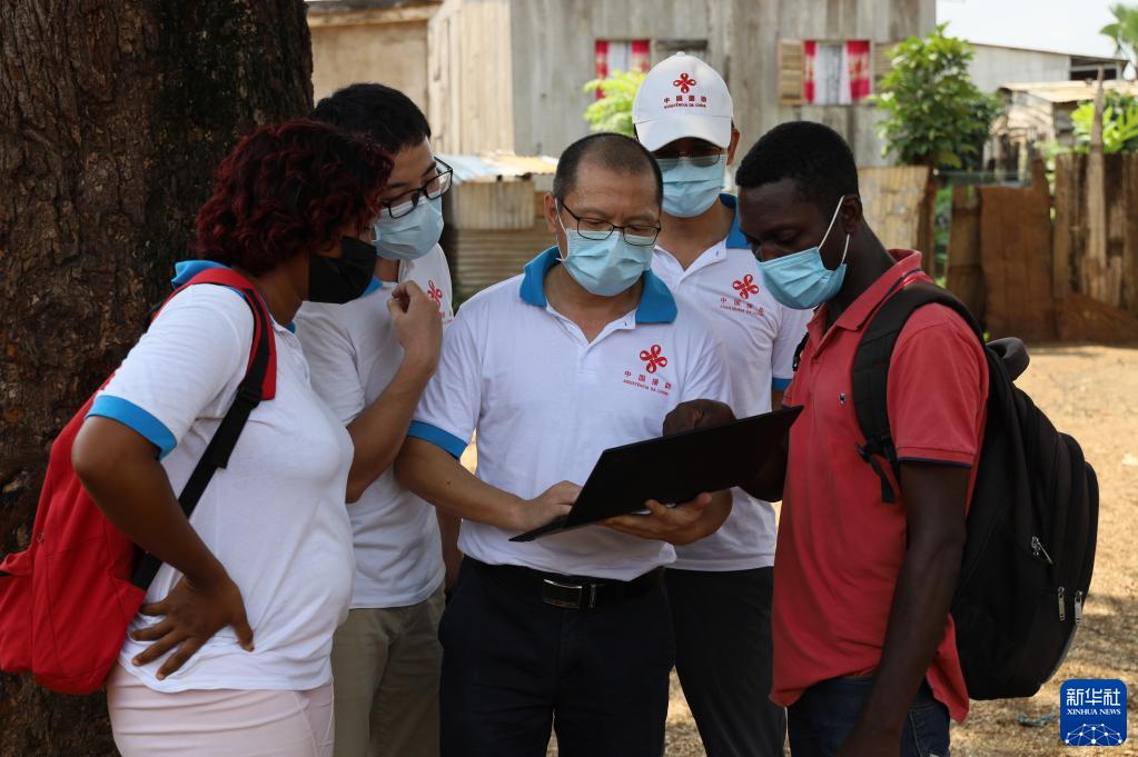 这张2021年7月24日拍摄的资料照片显示,在圣多美和普林西比(简称圣普)首都圣多美郊区,中国援圣普抗疟专家组开展全民服药项目。新华社发(中国援圣普抗疟专家组供图)