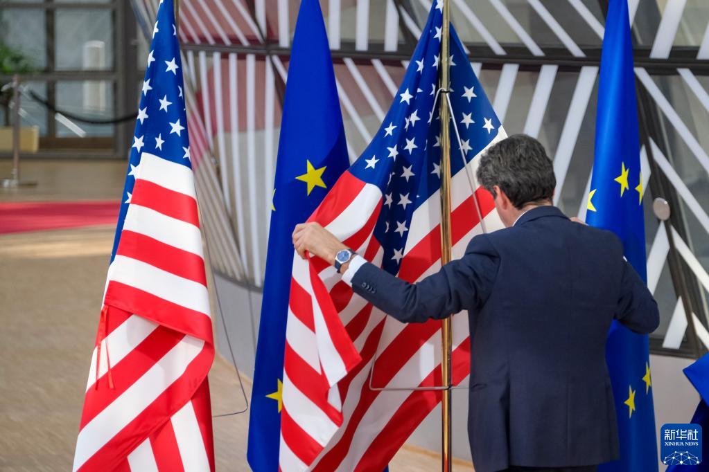 2022年3月24日,工作人员在比利时布鲁塞尔的欧盟总部整理美国国旗。北约、七国集团和欧盟三场峰会24日在比利时布鲁塞尔召开。新华社记者 张铖 摄