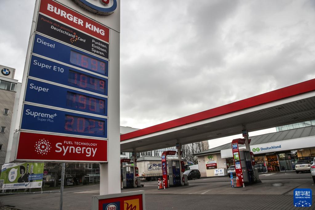 这是2022年2月25日在德国法兰克福拍摄的一家加油站屏幕上显示的油品价格。随着乌克兰局势骤然升级,欧洲股票、外汇、大宗商品等市场24日大幅震荡,油气市场价格更是出现巨幅波动。新华社发(阿曼多·巴巴尼摄)