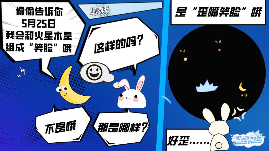 5月下旬,月亮将会运行至黎明时的东方低空,与行星们依次相会。5月25日,月亮将与火星和木星相伴,组成一个“歪嘴笑脸”图案。