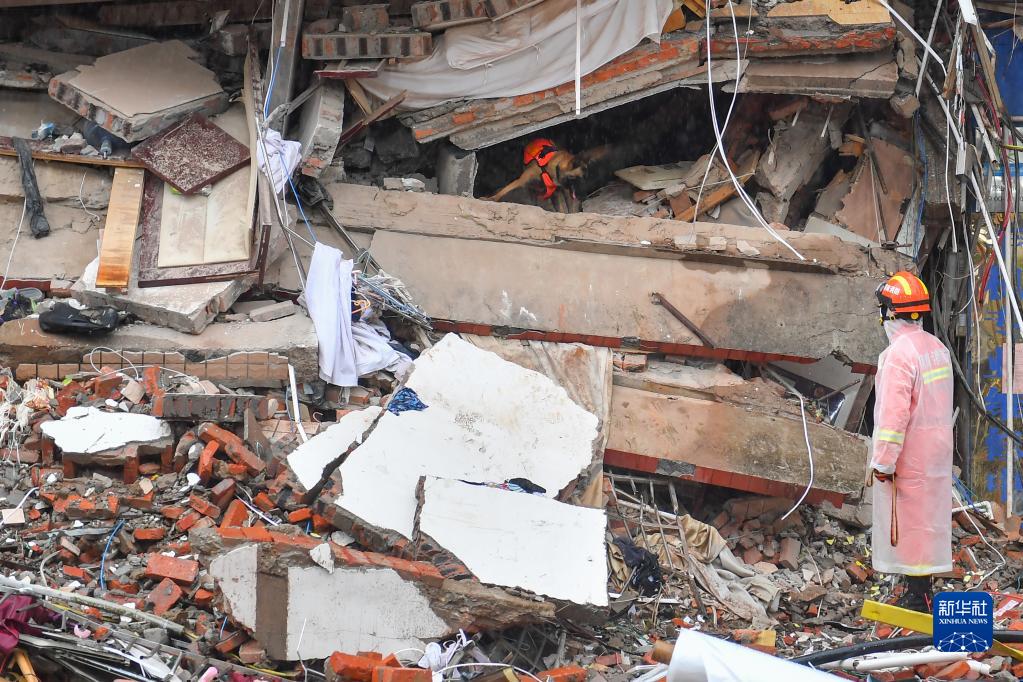 4月30日,救援人员带着搜救犬在湖南长沙居民自建房倒塌事故现场进行救援。新华社记者 陈泽国 摄