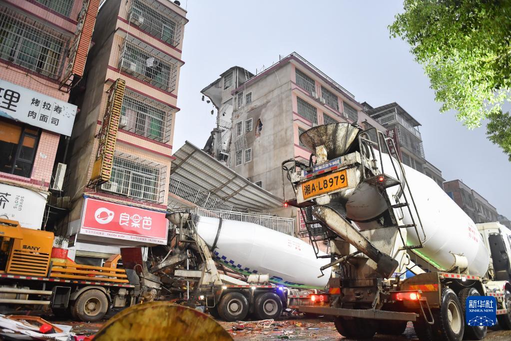 4月30日,救援车辆在事故现场为两侧房屋浇筑混凝土以加固房屋。新华社记者 陈泽国 摄