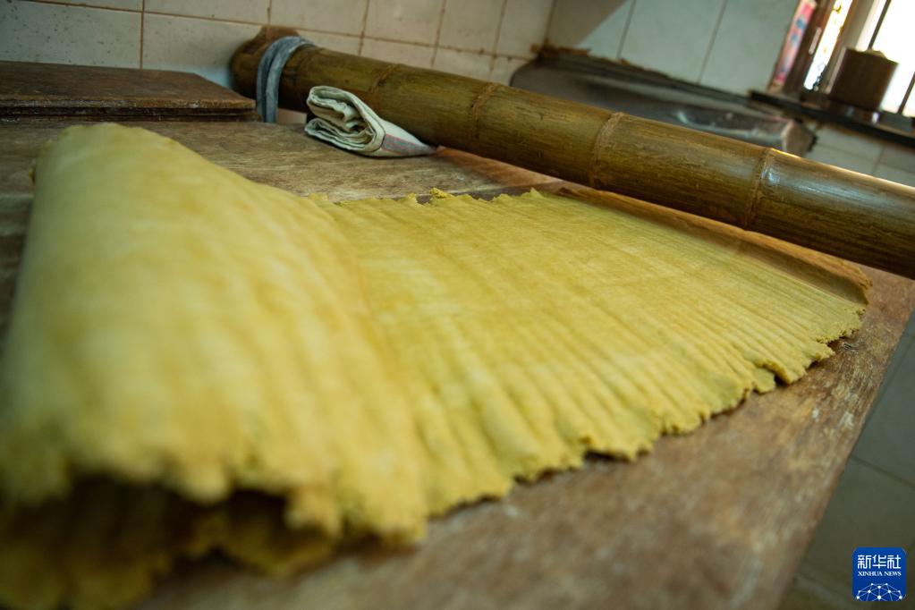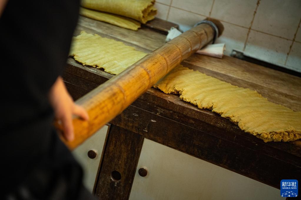 一晃一颠,李文龙坐在三丈长的大竹竿一段,现场演绎制面。在一上一下游刃有余的弹跳中,竹竿不断碾压面团,面粉粒子相互黏合紧扣。看似轻松实则是一项体力活,李文龙要和面团这样“跷跷板”近一个钟头,经过万次的反复碾压,方能印出通透薄软的面皮。