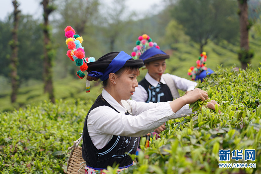 采茶工人正在采摘春茶(4月13日摄)。新华网发(董孟良 摄)