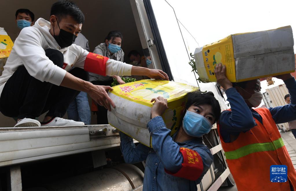 2020年3月3日,在广西南宁国际铁路港,南宁车务段“青年突击队”队员黄莹莹(右二)在搬运广西驰援湖北物资。新华社记者 陆波岸 摄